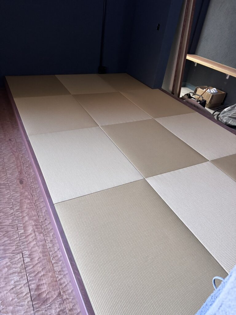 畳はダイケンの和紙表を使い、市松敷きに。 濃淡を交互に配置することで、面積以上の奥行きと、視線のリズムが生まれています。 いかにも“和室”になりすぎないのがポイント。